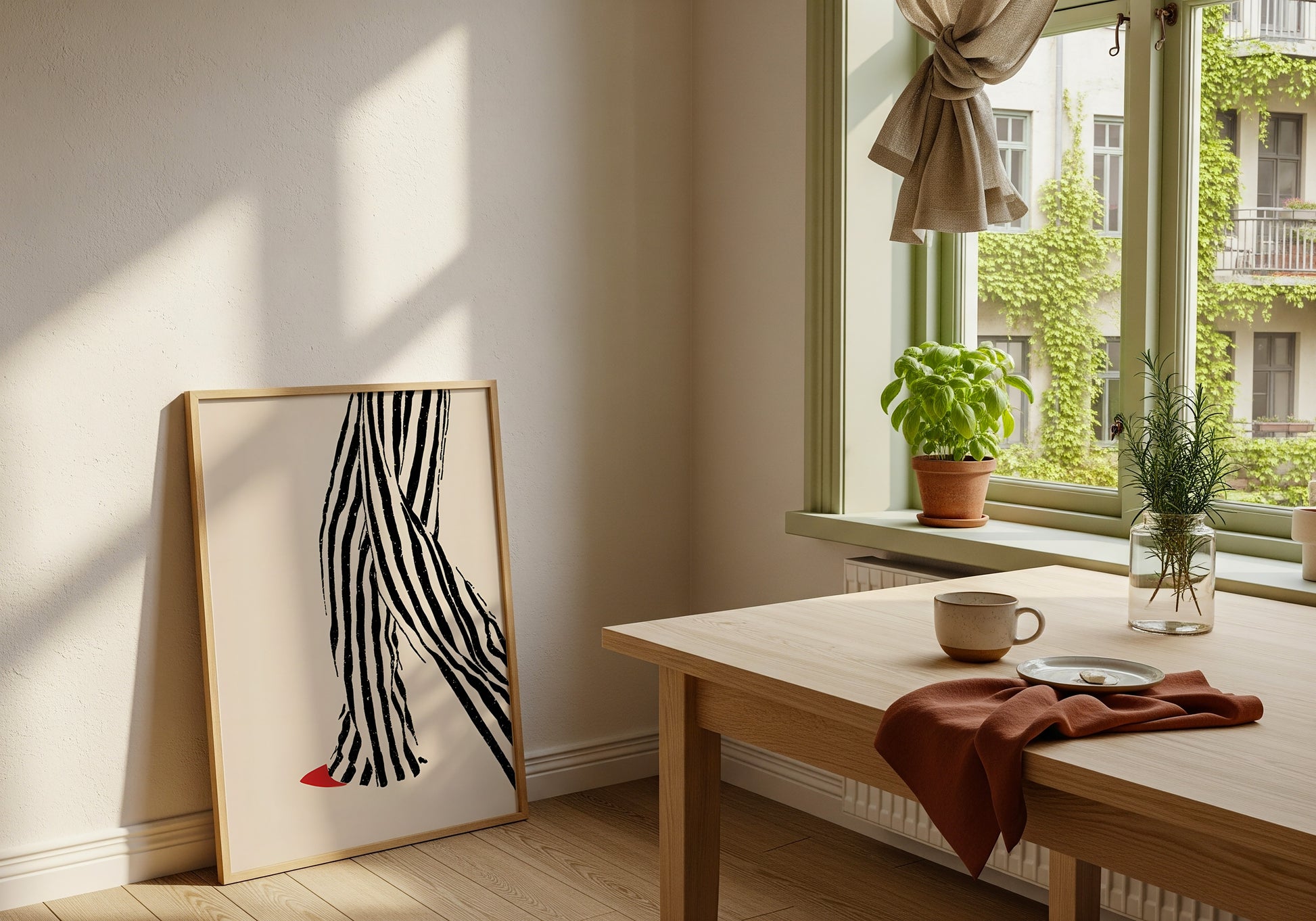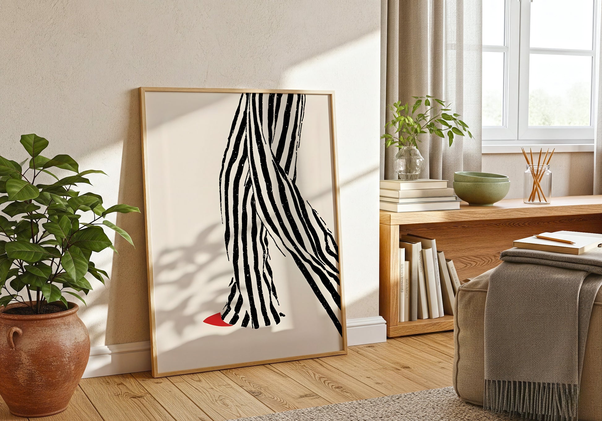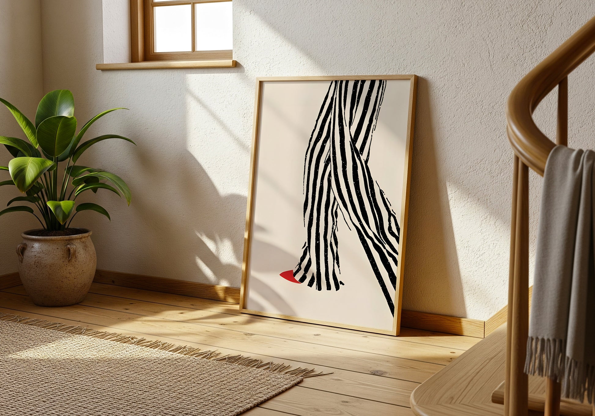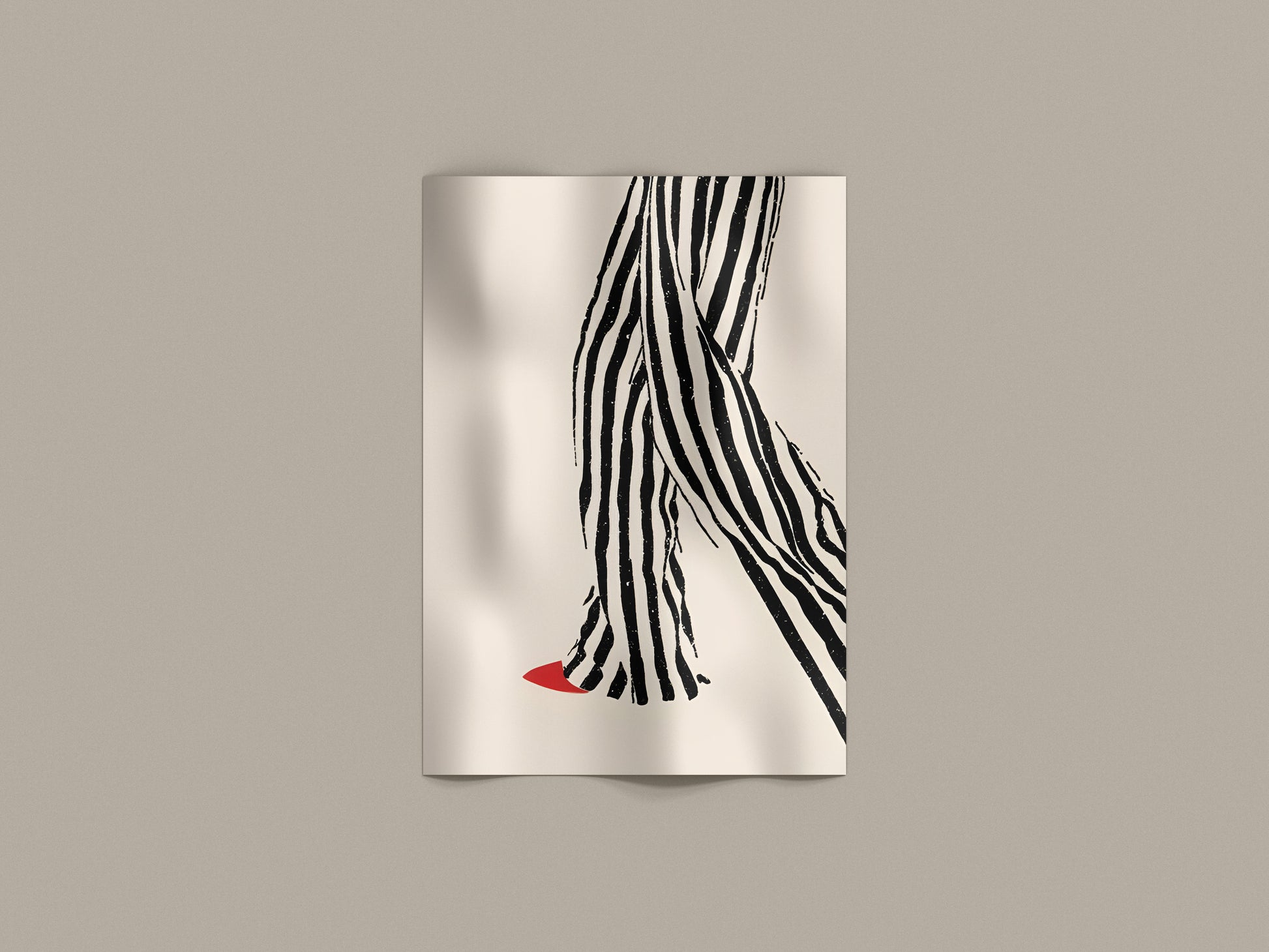Un’illustrazione elegante e contemporanea che mette al centro il movimento: pantaloni a righe dal tratto materico e una scarpa rossa che spezza la scena con un dettaglio audace.