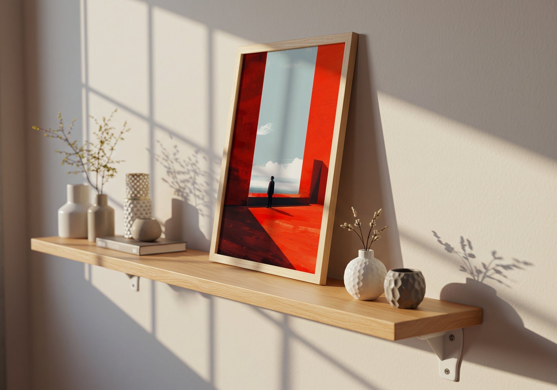 Un’immagine dal carattere cinematografico, in cui una figura solitaria osserva il paesaggio oltre un imponente varco rosso. Le superfici geometriche e le ombre profonde dialogano con la luce chiara del cielo, creando una scena sospesa e meditativa.