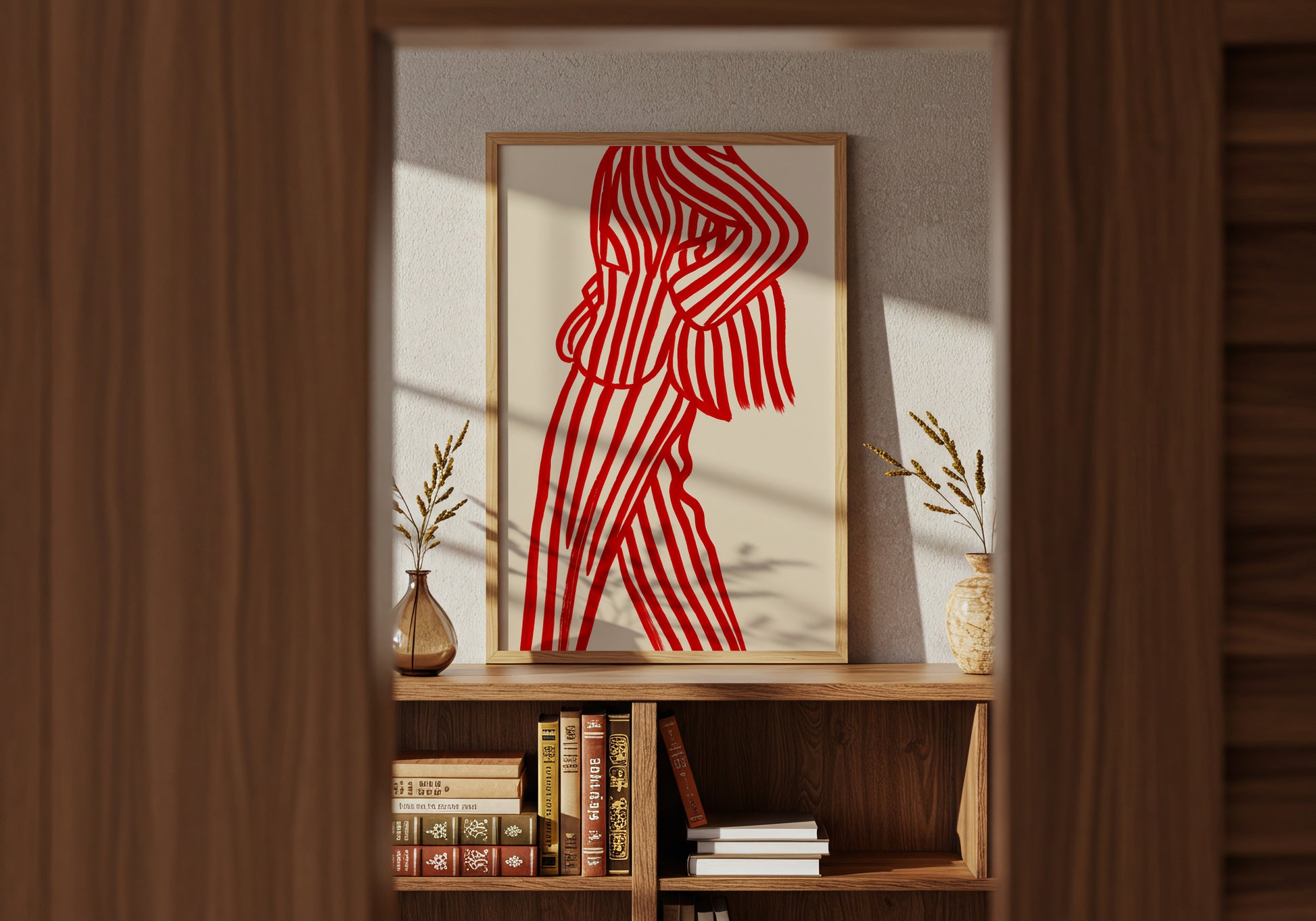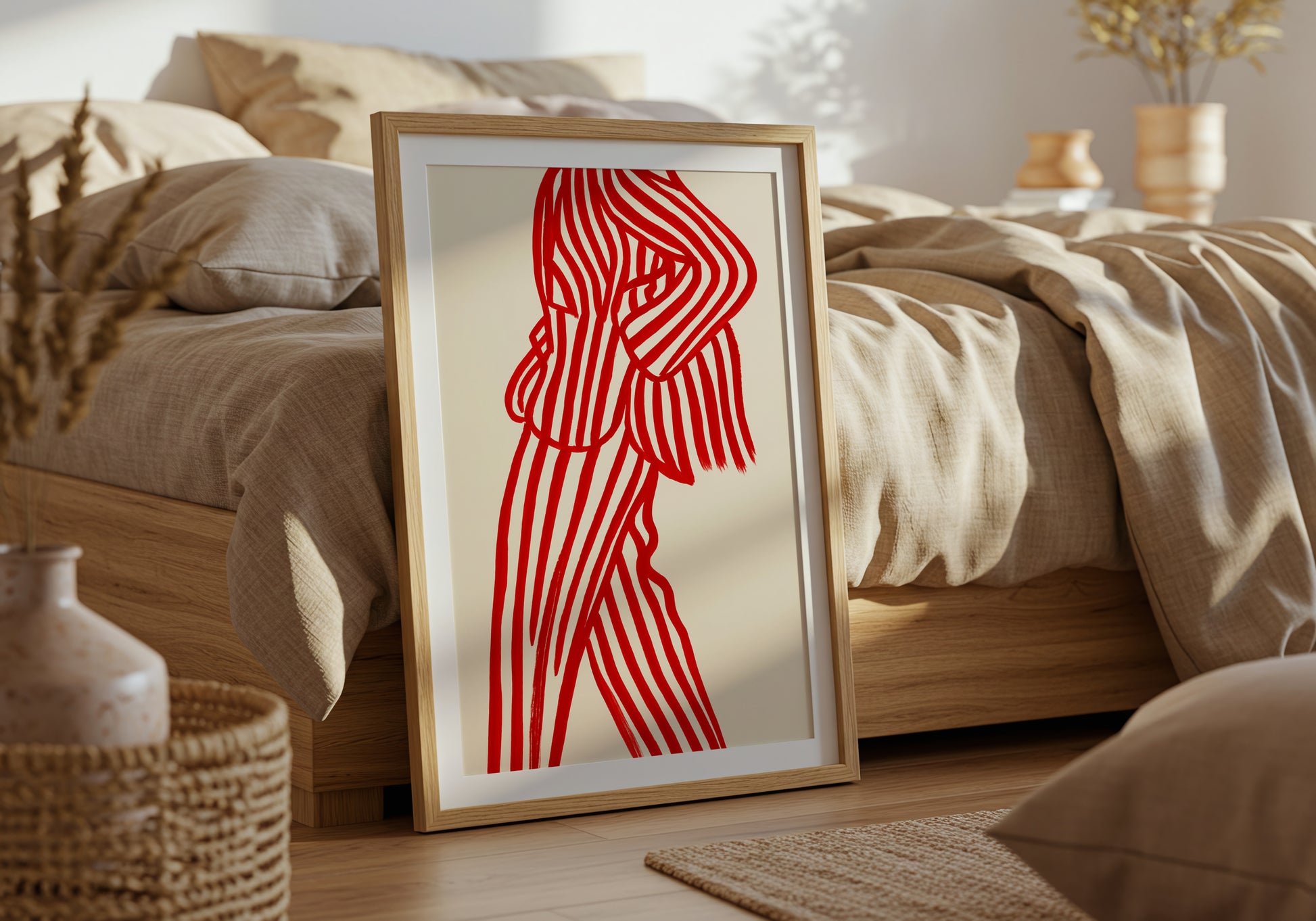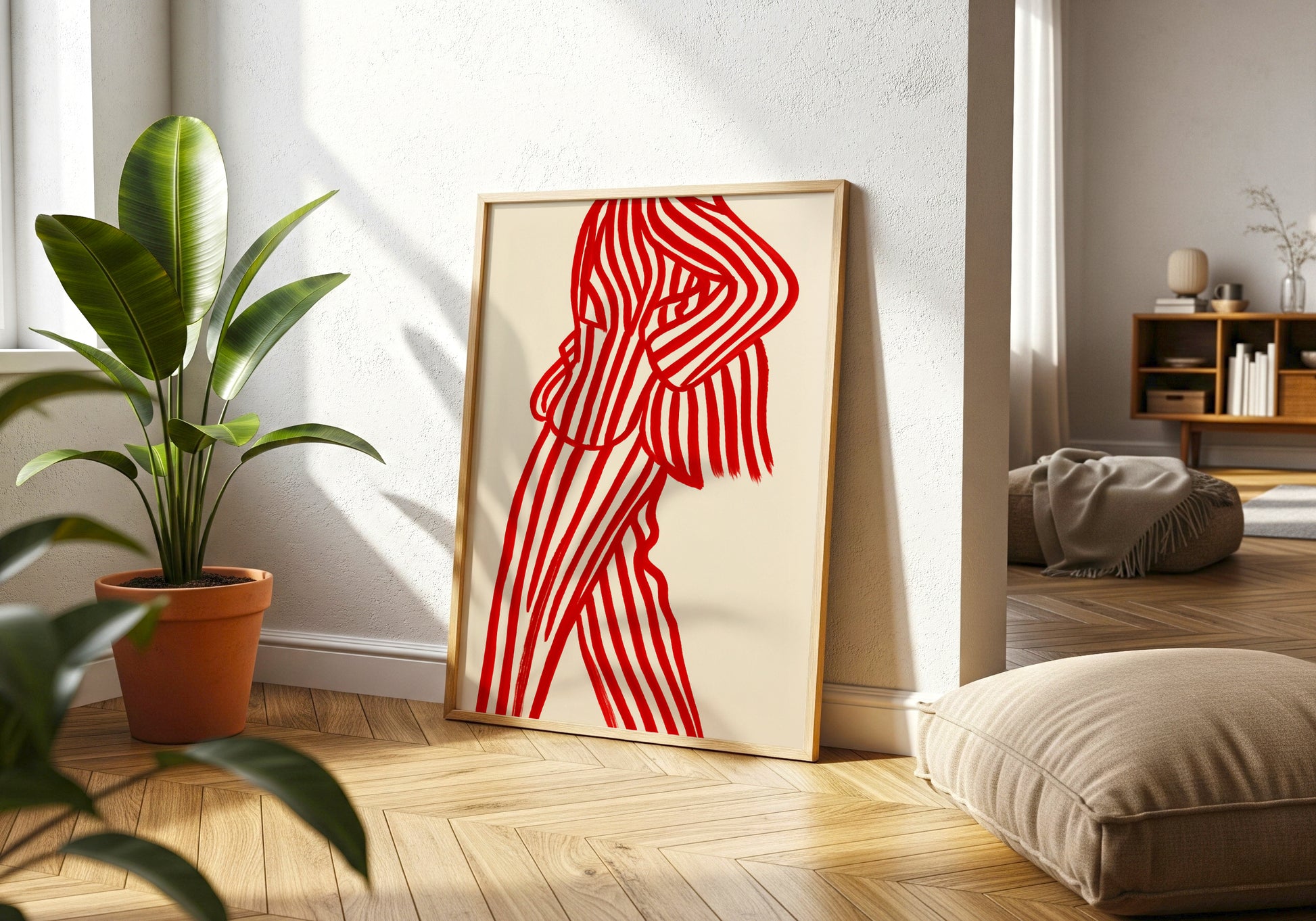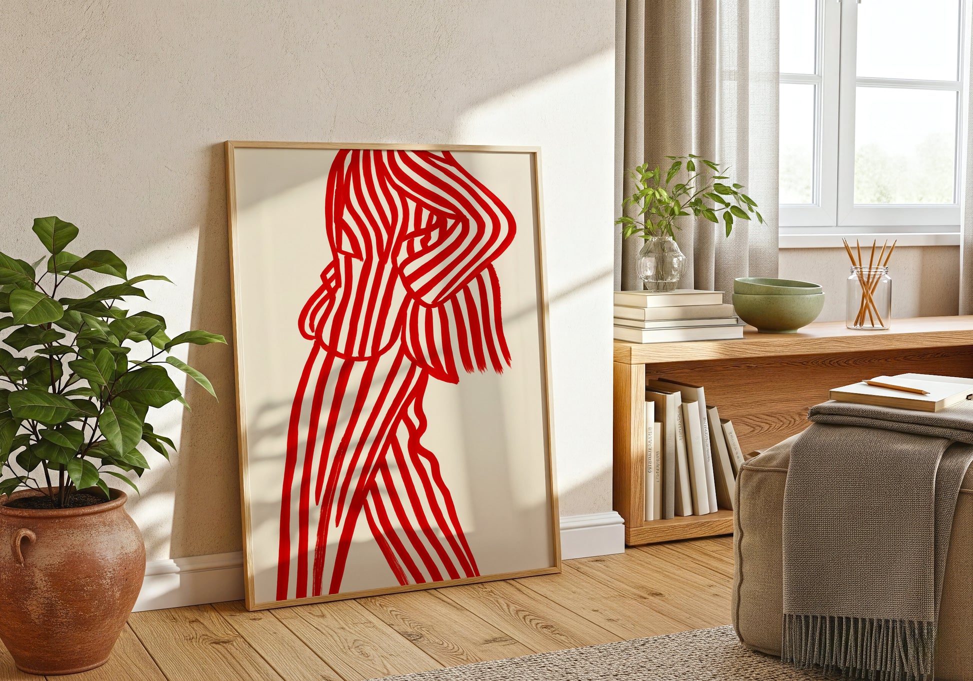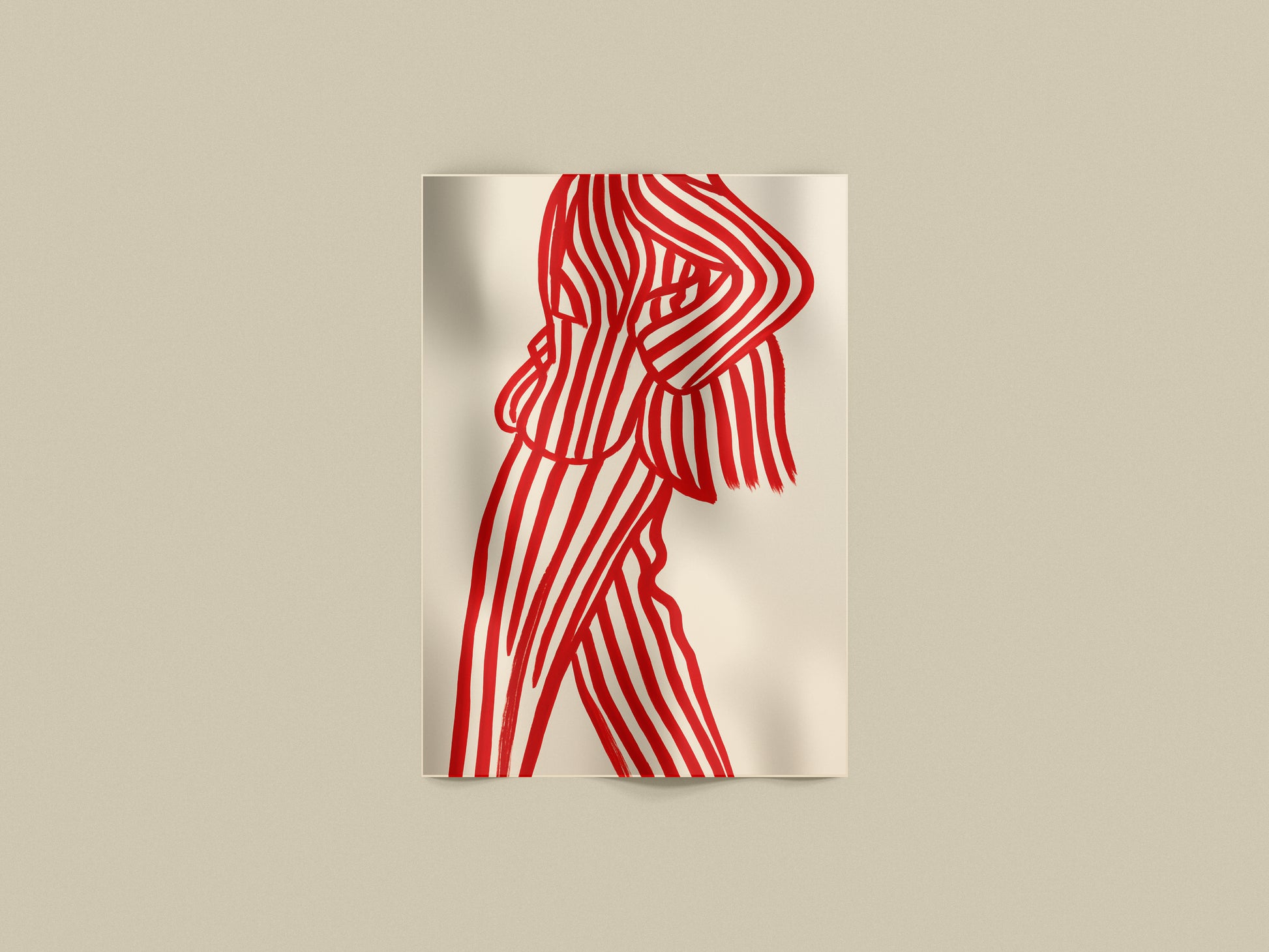 Un poster dal forte impatto visivo, caratterizzato da una figura stilizzata composta interamente da linee rosse fluide e continue. Il corpo, rappresentato in modo astratto e dinamico, crea un intreccio di forme armoniose che catturano lo sguardo e danno movimento all’intera composizione.