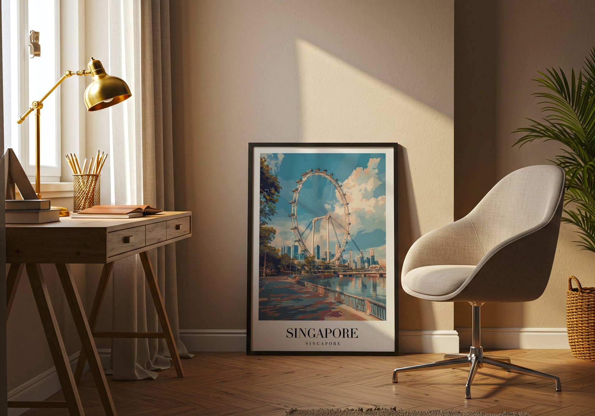 Un poster che cattura l’eleganza futuristica di Singapore, con la celebre Singapore Flyer che domina il panorama e riflette sulle acque calme della baia.