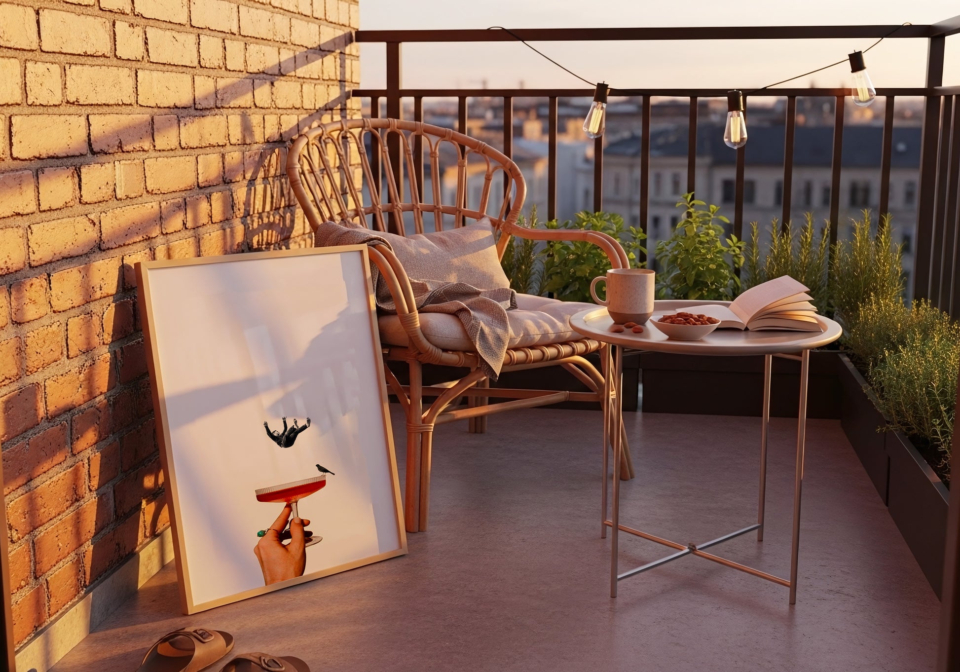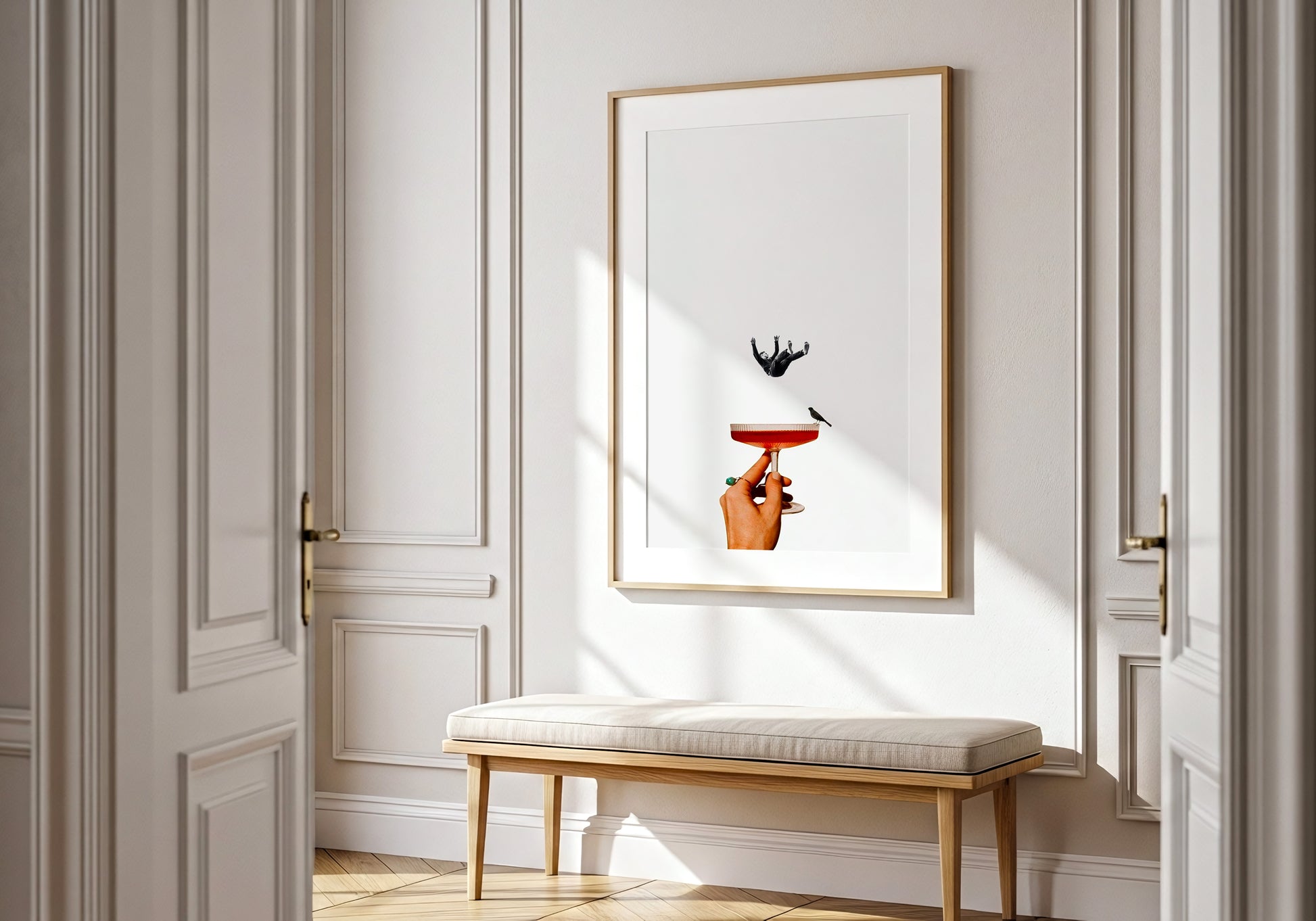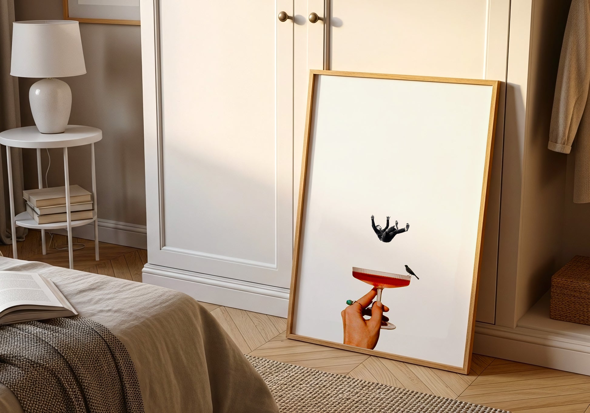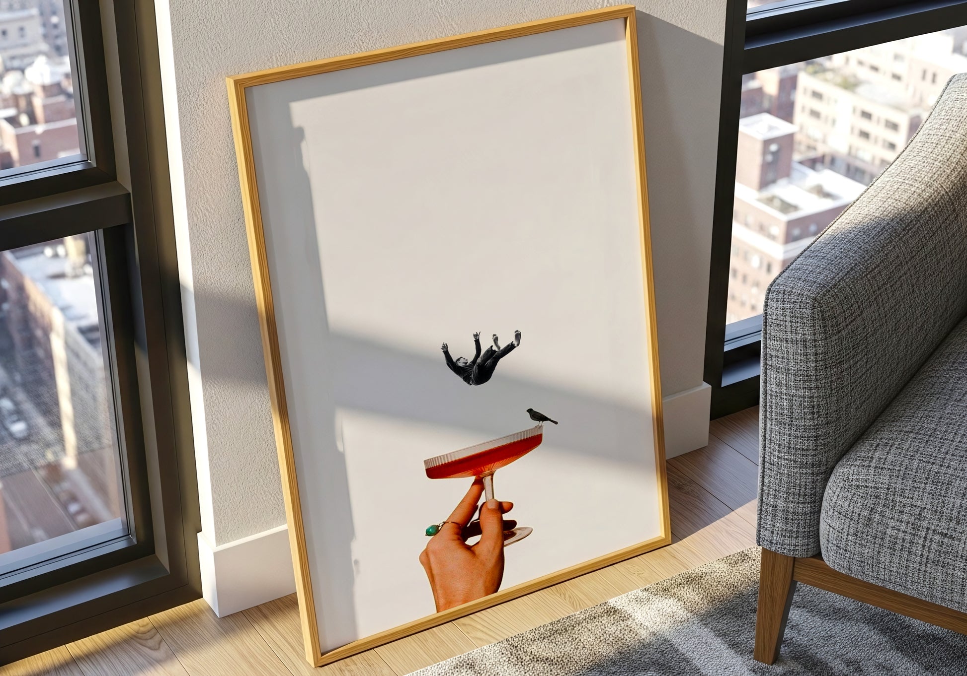 Poster dal design surrealista che unisce eleganza e mistero: una mano regge un calice con un piccolo uccello, mentre una figura sospesa sembra cadere nel vuoto. Il contrasto tra i toni neutri e i dettagli rossi crea un equilibrio visivo raffinato, evocando leggerezza e introspezione. Ideale per chi ama l’arte moderna e le composizioni concettuali.