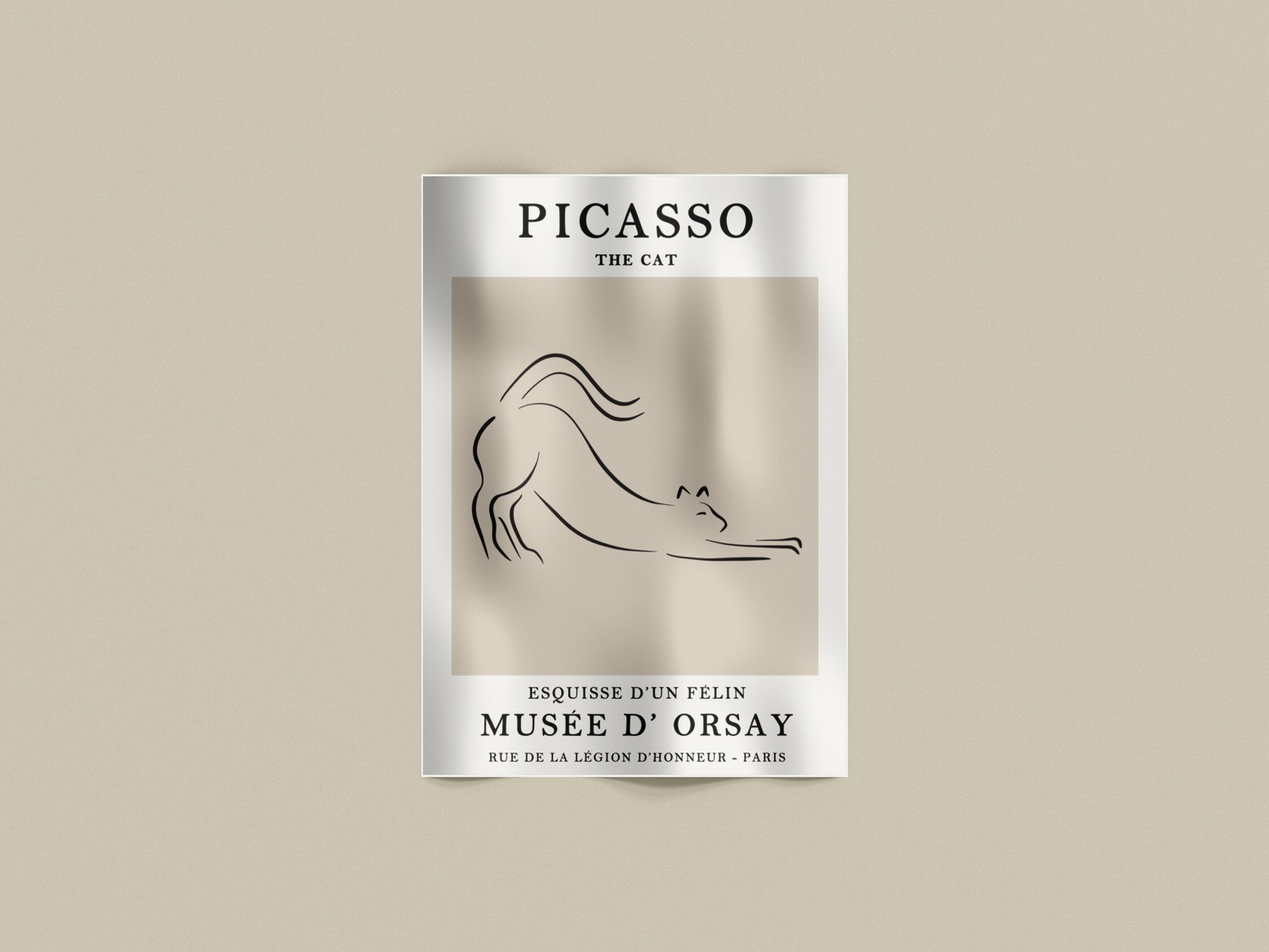 “The Cat” è un poster elegante e raffinato ispirato alle opere lineari di Pablo Picasso. L’immagine raffigura un gatto nell’atto di stiracchiarsi, realizzato con pochi tratti neri netti che trasmettono grazia, movimento e leggerezza. Questo stile minimalista, tipico del periodo maturo dell’artista, esprime la sua capacità di raccontare la vita con la sola forza del segno.