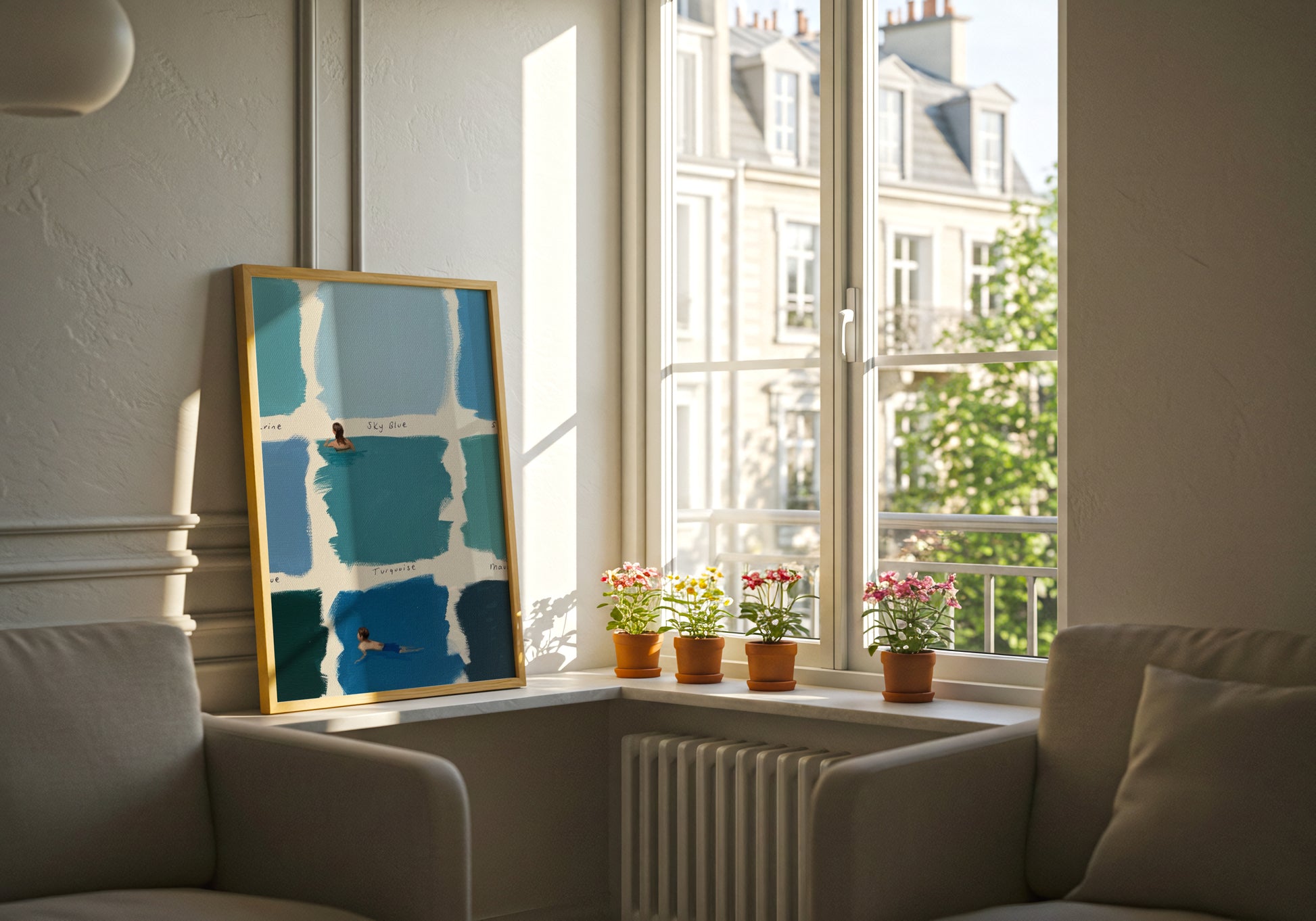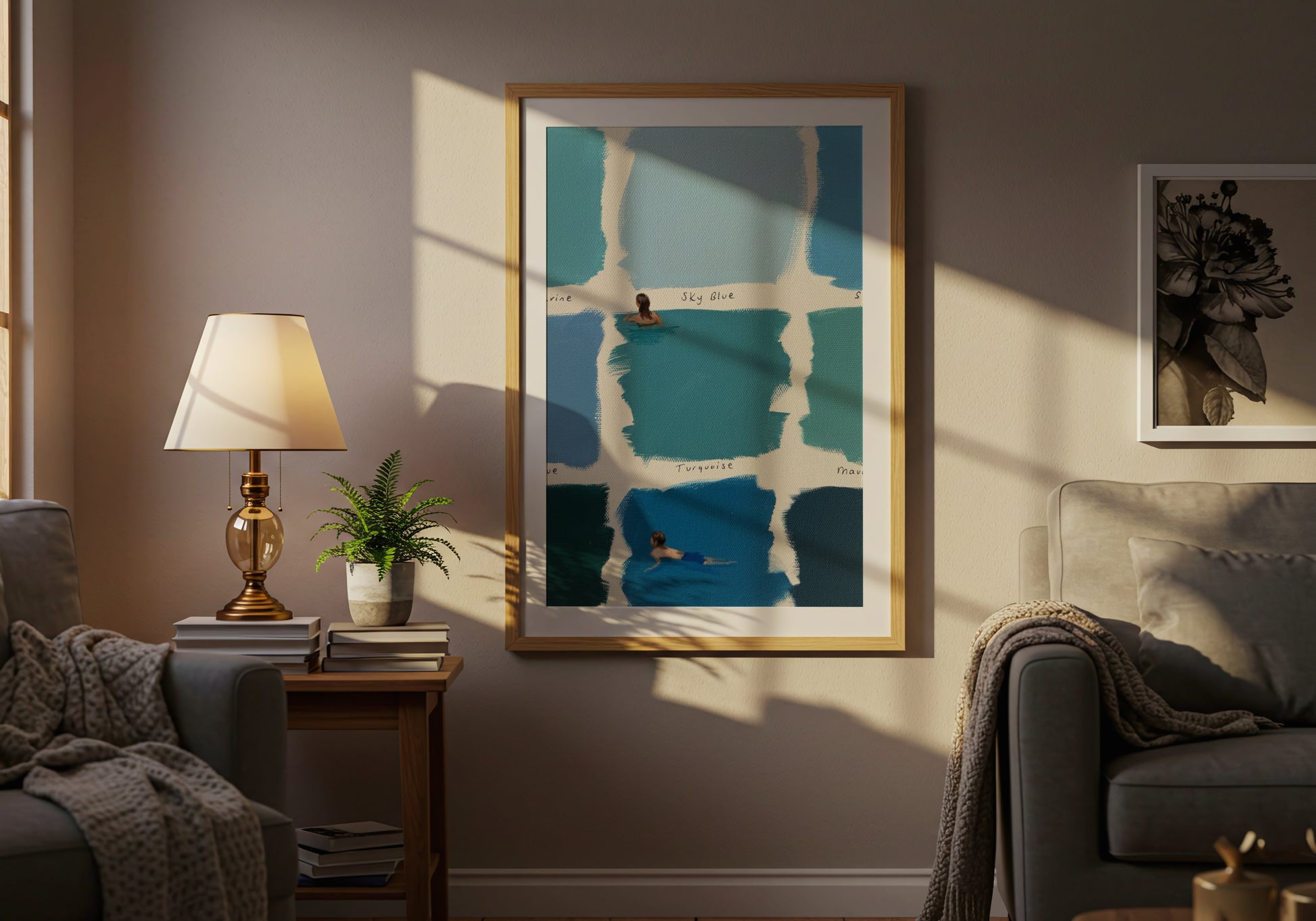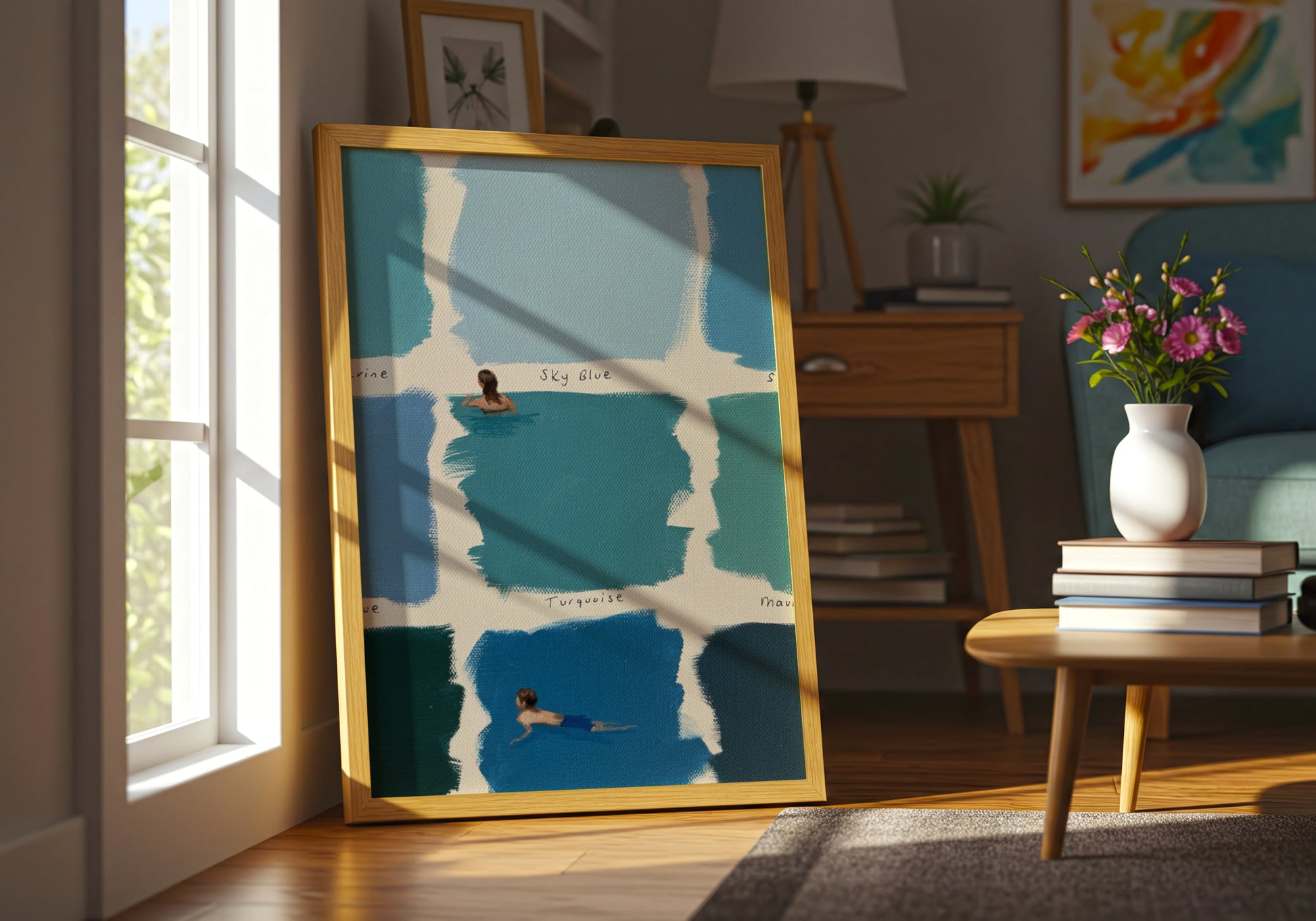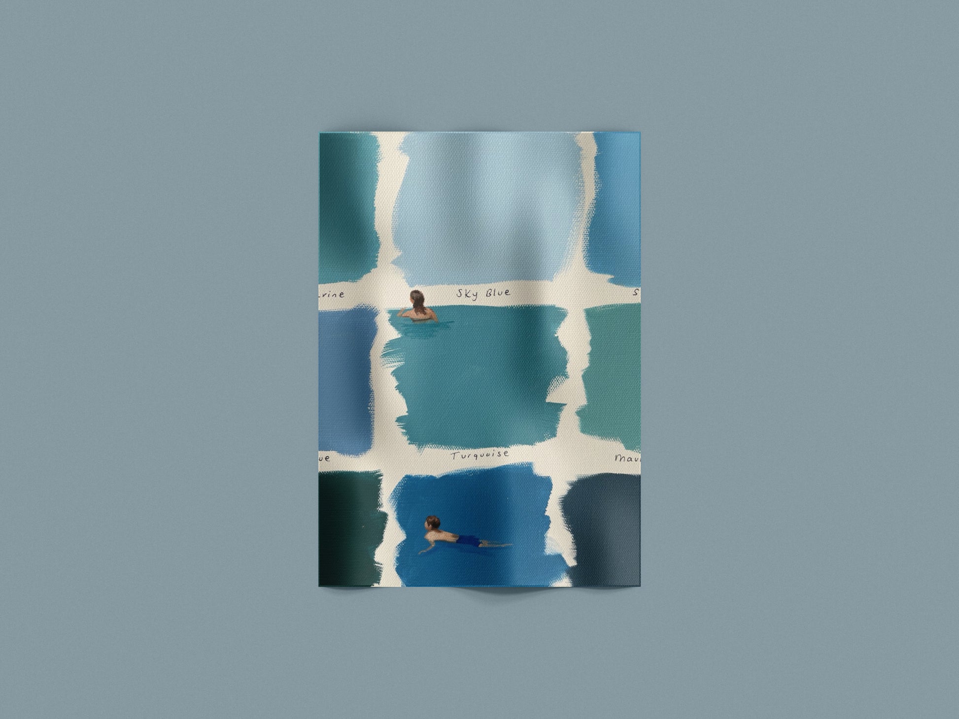 Una composizione delicata che unisce campioni di blu dipinti a mano e piccole figure immerse nell’acqua. Le diverse tonalità – dal turchese al blu profondo – creano un effetto fresco e rilassante, mentre le scene di nuoto aggiungono un tocco narrativo leggero e contemplativo.