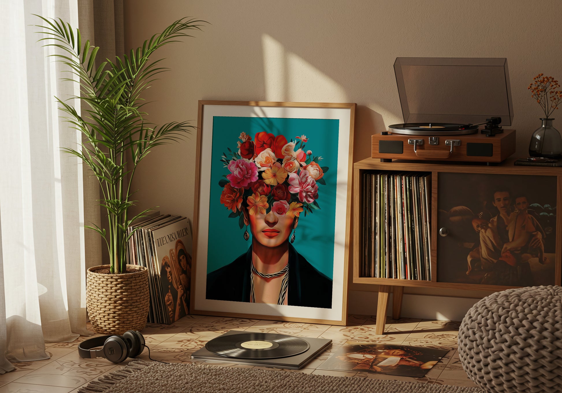 Un ritratto vibrante e contemporaneo in cui il volto di una figura femminile si fonde con un’esplosione di fiori dai toni intensi del rosso, rosa e arancio. La composizione, ricca e dinamica, crea un contrasto affascinante con lo sfondo turchese, mettendo in risalto la delicatezza dei petali e la forza dello sguardo.